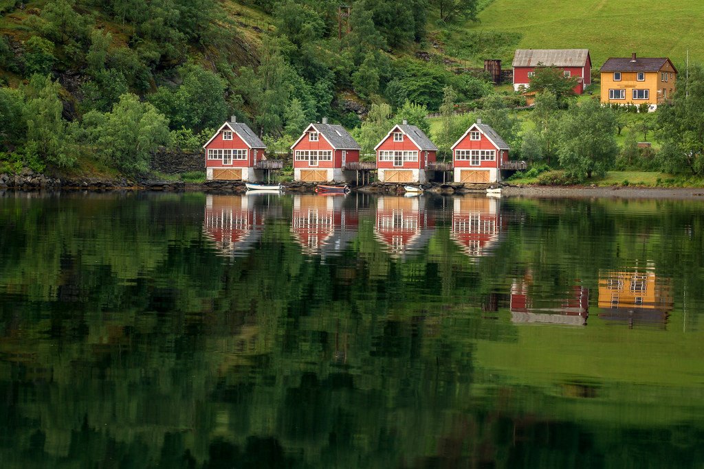 boat houses in Flåm, Norway @ morning (by St3ph8n) Tags:boat houseFlåmlandscapeNorgeNorwayreflectionwater