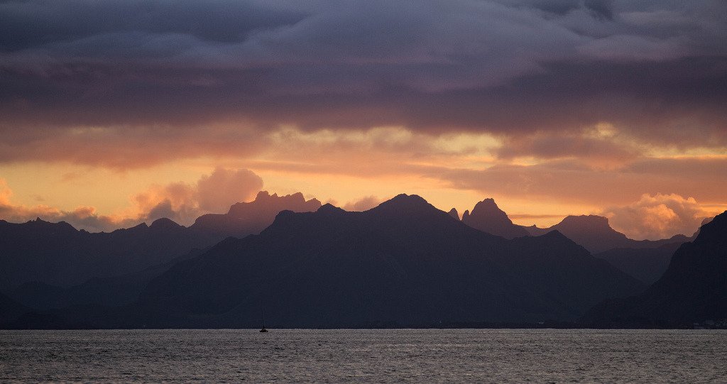 Sailboat in Lofoten sunset, Norway. (by