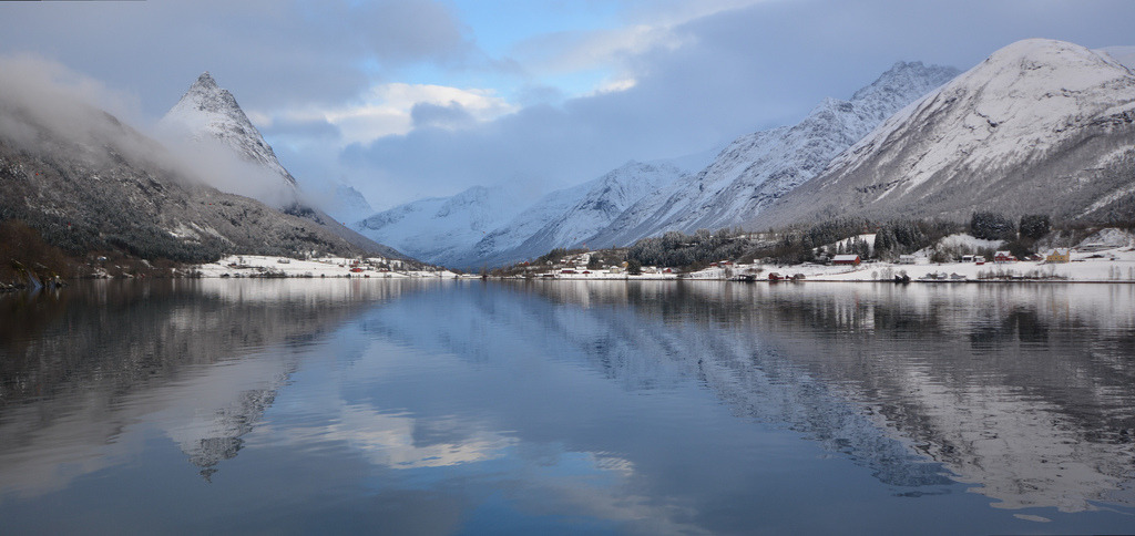 Tåke over Tyneskollen, skyer over Rånahalvøya. (by