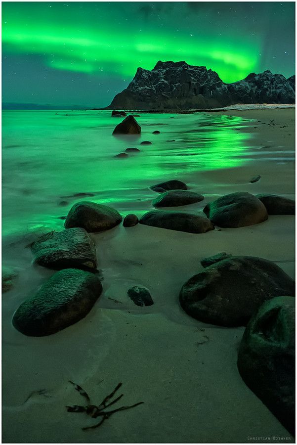 Northern lights over the beach – Uttakleiv, Lofoten, Norway by
