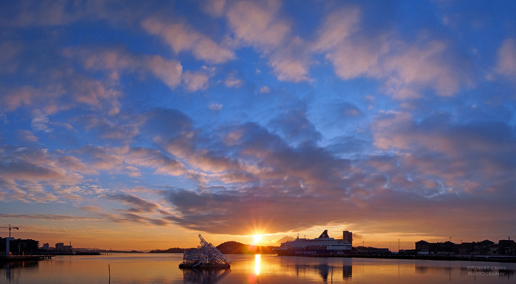 Hello and goodbye: Norwegian sunset version by RobertCross1 (off and on) Rare winter sunset seen from the quay in front of the Oslo Opera House. I took this shot just before 2:30 pm. The sun had only just come out a little while before, and within minutes it would be gone once again, set behind that hill. Needless to say, I was snapping that shutter like my life depended on it.