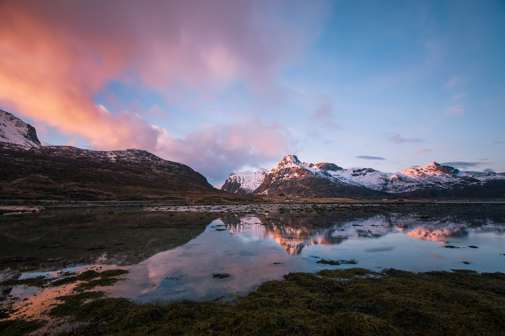 Mountains in Lofoten, Norway by dyorex I stayed in Lofoten for five days. The weather there was pretty bad all the time except on this day I could finally see the magical place under a clear sky. With the beautiful sunset and http://flic.kr/p/s3ffj1 Tags:FlickrNorway