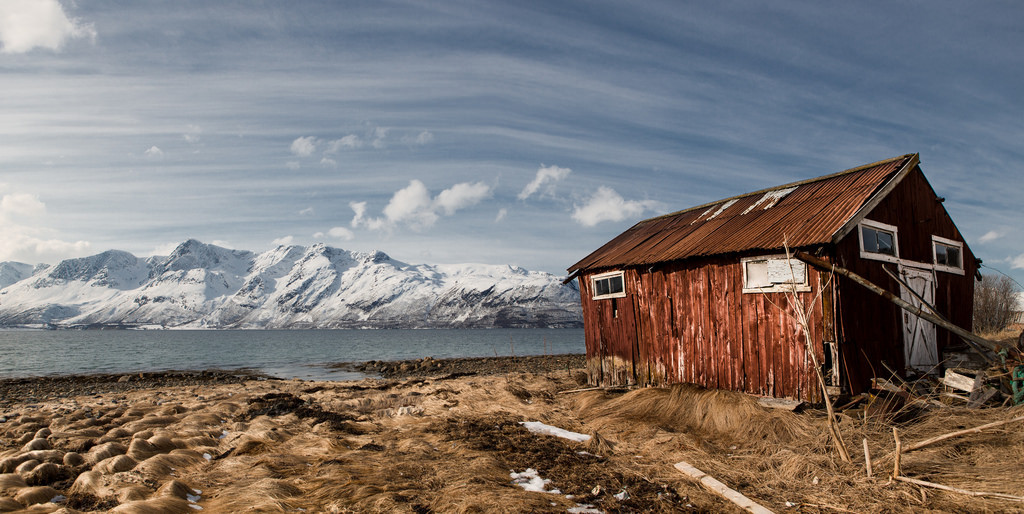 Old fashion boathouse | Lyngen by Einar Angelsen Snow in the mountains and the sun is up. Life is good http://flic.kr/p/rFzLWJ Tags:FlickrNorway