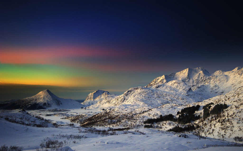 Winter in Lofoten by steinliland The colours in the sky are not manipulated. The Desember and January light is very intense and colourfull. This shot is about how I experienced the moment. http://flic.kr/p/9byk8U Tags:FlickrNorway