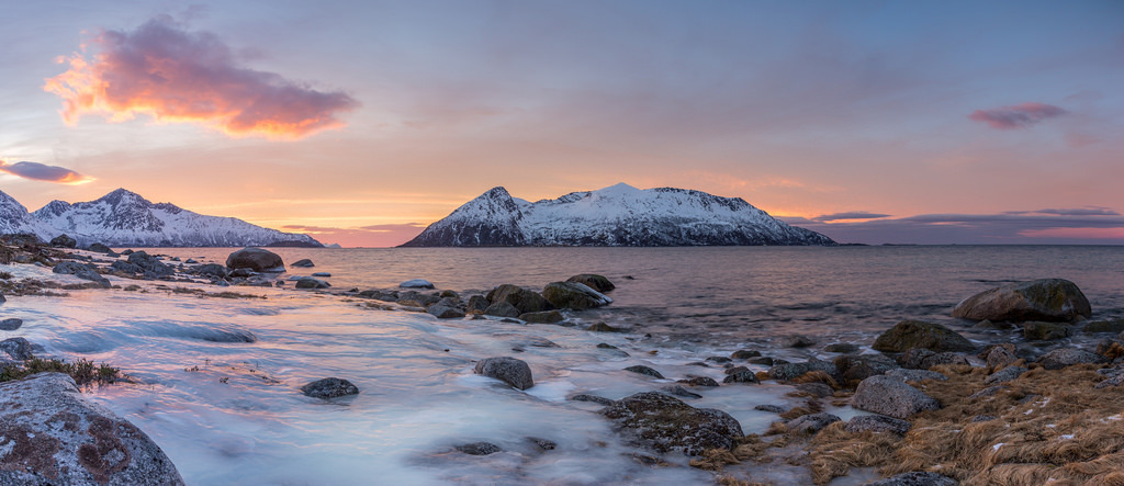 Icy Sunset by hanneketravels Sunset at Rekvik, on the outer coast of Kvaløya near Tromsø in Northern Norway. The island in the middle is Sessøya. The day started out grey, but towards sunset it cleared up – with some fantastic colours as a result!