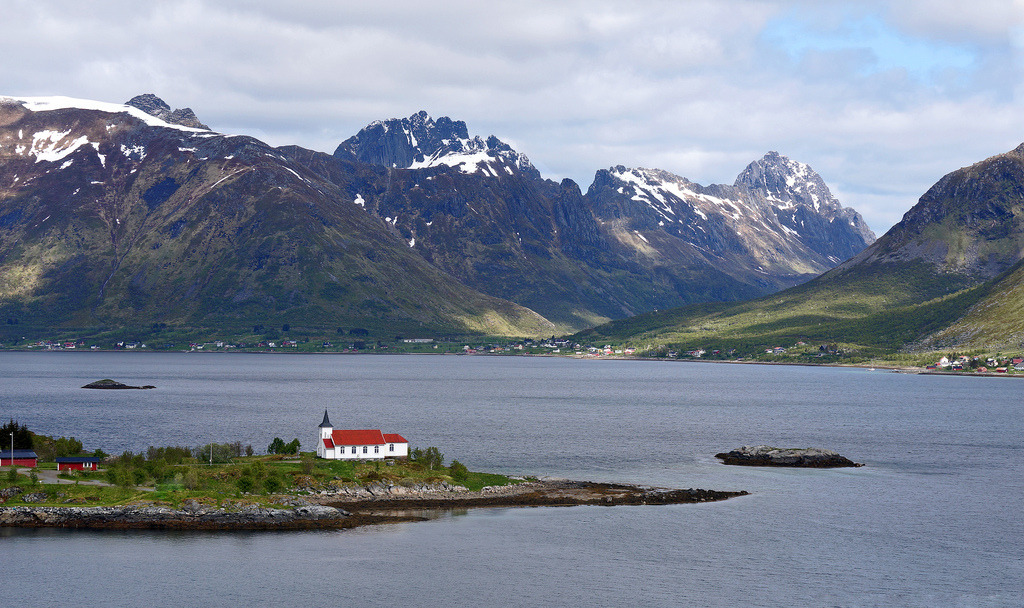 Sildpollnes Church is located on the Sildpollneset peninsula on the island of Austvågøya. The white wooden church was built in 1891 as a “bedehus” and is a very popular location for photographers due to its wonderful location in the middle of a fjord.