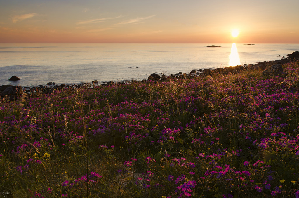 Nykvåg midnight sun by Ron Jansen – EyeSeeLighT Photography Taken at 00:12. With the lovely midnight sun glowing I was looking for a composition, when suddenly these glowing pink flowers appeared in my sight!