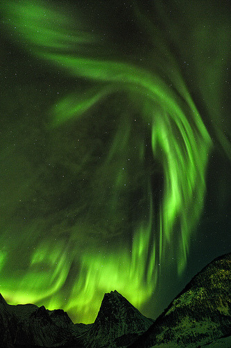Aurora in Selfjorden by Garcia Foto Aurora borealis dancing over the mountain Bunkeskjulet in Selfjorden on the island Senja in Northern Norway. The mountain itself is more than 800 meters above the sea level. If looking at the large size, you will easily identify the Big Dipper at the centre of the image, also giving you a hint of the scales involved.