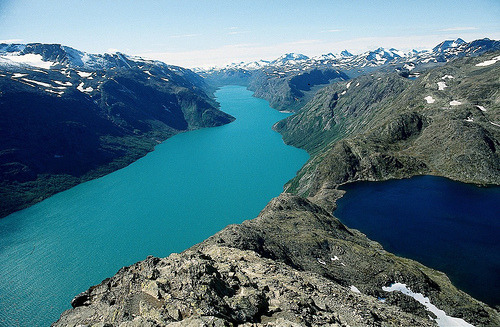 My favourite hike (… so far) in Jotunheimen, Norway. The darker lake on the right side (Bessvatnet) is 400 m higher above sea level than the lake on the left side (Gjande). http://flic.kr/p/B8vvs
