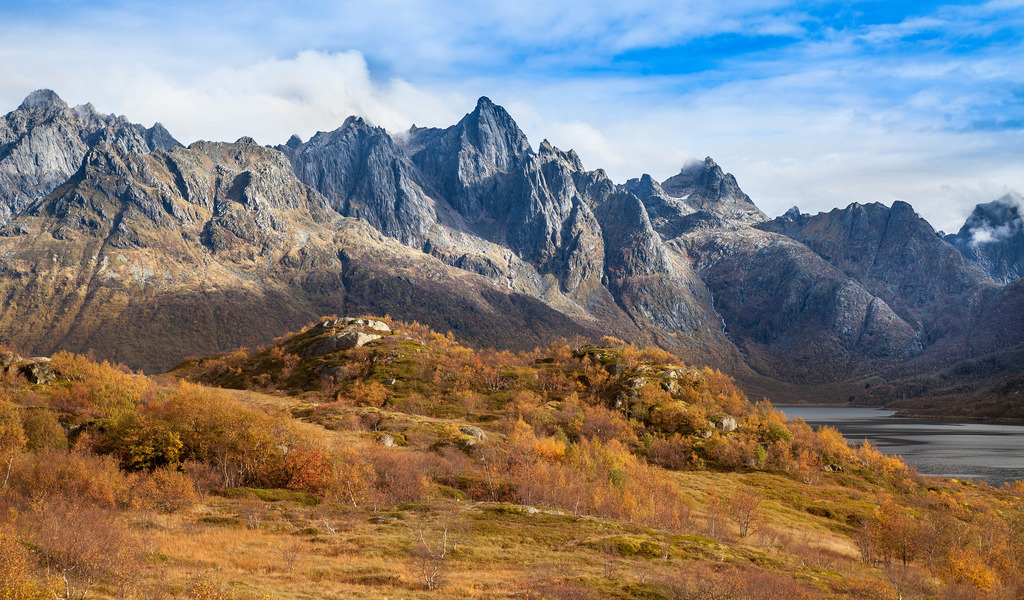 The peaks from left to right: Higravtindan 1146 m. Geitgallien 1070. Kroktindan 996.