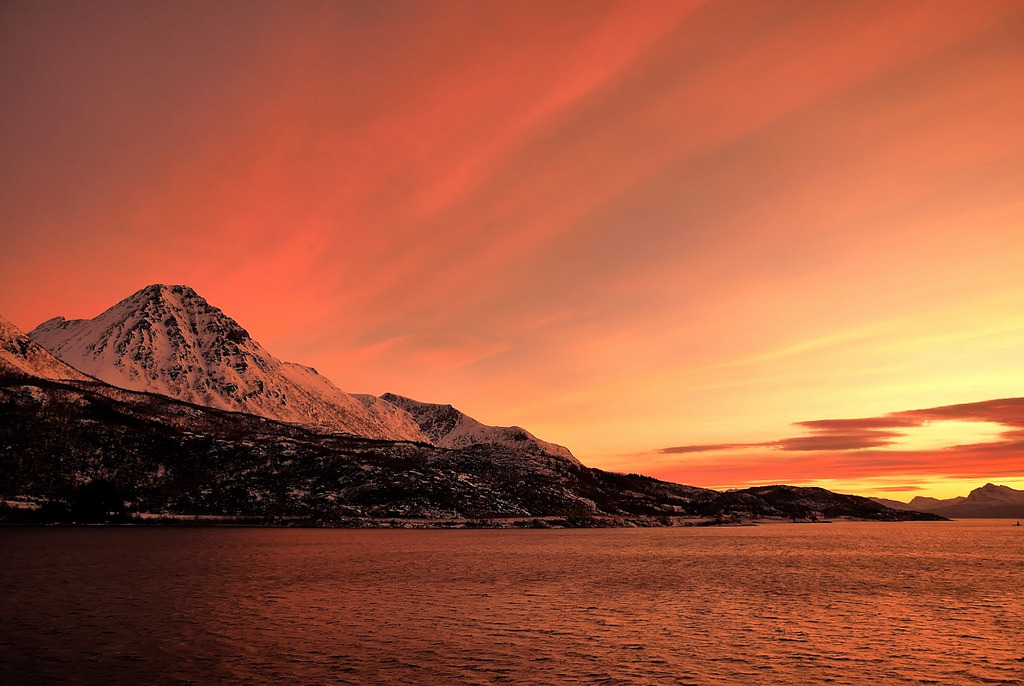 Last sunrise in Norway Arctic by JRJ. Tour to Norway Arctic – Day 10, Sunrise South of Harstad My tour lasted for 12 days. Todays photo is from day 10 on my way South with the coastal express – and the last morning with such a fantastic Arctic sunrise as late as 09.12AM. The position is somewhere South of the Arctic town Harstad.