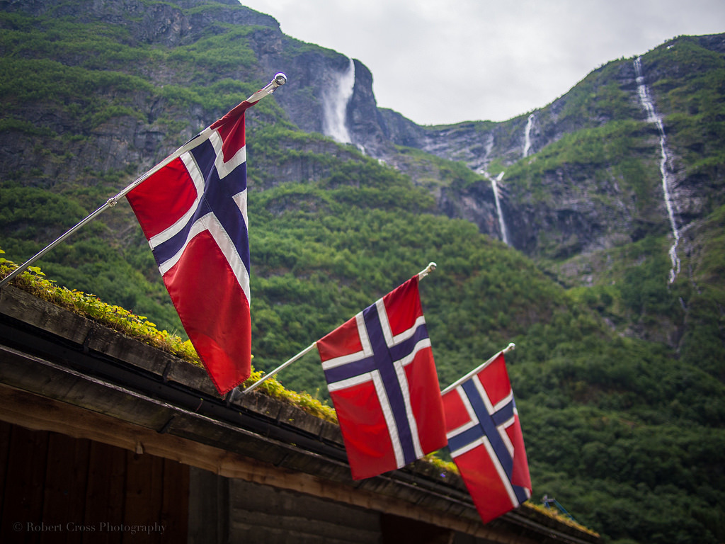 The Flags of Fjord Norway by RobertCross1 (off and on) Norwegian flags fly as waterfalls plunge over the edge of fjord walls more than 4,000 feet (1200 m) overhead. At Gudvangen, at the end of the Nærøyfjord. http://flic.kr/p/x7qTZG Tags:fotolandscapenatureNorgeNorwayNorwegianphotophotographyScandinavian