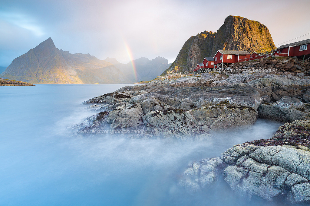 Lofoten Scenery – Hamnoy Village. by baddoguy The horizontal long-exposure seascape shot of red rorbuers in Hamnoy fishing village with the sunlight illuminated mountain in the background and rainbow in the morning, Moskenes Island, Lofoten archipelago, Nordland, Norway.