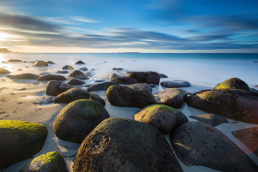 Uttakleiv Beach at Sunset (Lofoten) by baddoguy The horizontal image of famous and scenic Uttakleiv Beach in Vestvågøy, Lofoten (Norway) at Sunset. It has scenic rocky shoreline and white sand beach. http://flic.kr/p/QBNRp6