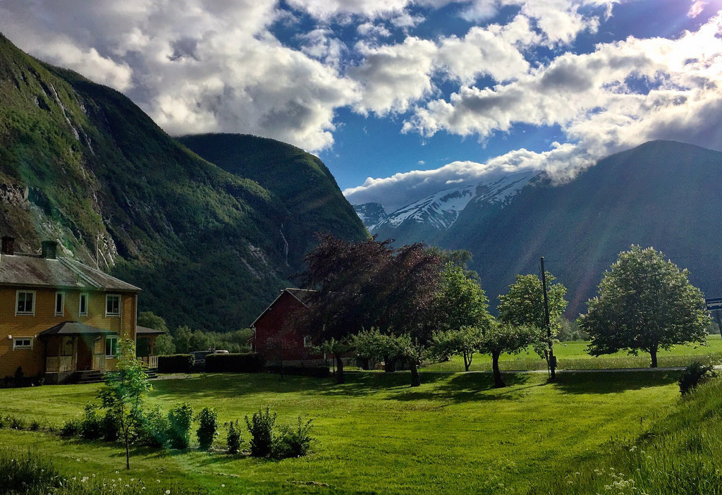 Farm between mountains (in backlight). Borgund, Norway West by JRJ. After visiting the Tvindefoss waterfall I continued along the highway E16 through one tunnel app 16km and the world longest road tunnel some 24km long. And then coming up this valley leading up to the mountains to be crossed between West and East in Norway.