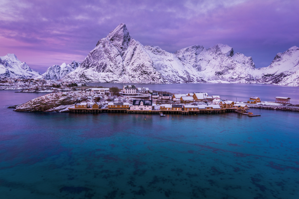 Sakrisoy by inkasinclair The view from the hill of Olenilsoya looking down on Sakrisoya in the Lofoten Islands. Reinbringen wasn’t safe in the conditions to do and wanting to get a bit of elevation this was perfect. From the top you get a 360 degree view, including the uniquely shaped Olstinden mountain. The orange rorbuers of Sakrisoy provide a wonderful contrast to the blue/torquise water and the pinky/purple twighlight sky that seems to last for hours in winter.