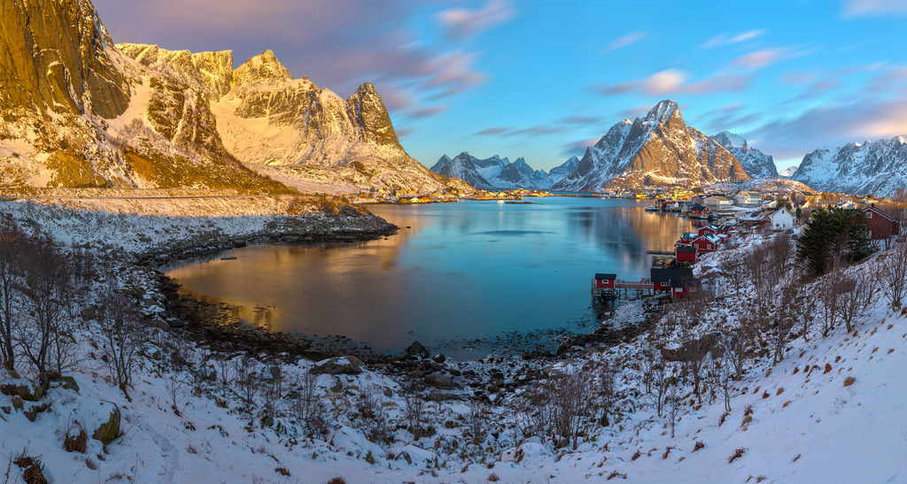 Morgens in Reine by jeglikerikkefisk Schon einen Monat ist vergangen, seit ich dieses Panorama aufgenommen habe. Die Zeit rast, mein Computer schuftet schwer bei den Bildmengen der Lofotenreise. Vor allem wegen der neuen Kamera mit höherer Auflösung dauert die Nachbereitung spürbar länger. Dafür ist das Fernweh umso größer, wenn ich mir die Bilder ansehe. Eine Landschaft, die fast schon zu schön ist!