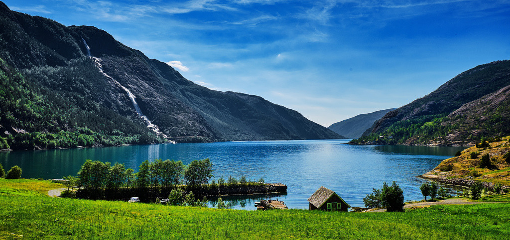 Langfossen waterfall runs down the steep cliffs on the south side of the fjord, just west of Fjæra.