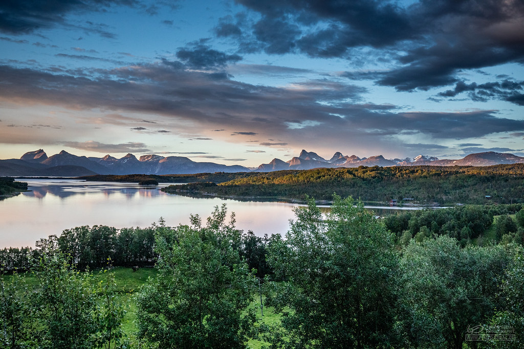 Das am Horizont auszumachende Gebirgsmassiv beherbergt die Berge Stortinden, Hoglhornet, Blomholatinden und Kobbenestinden, deren Silhouetten sich an der Wasseroberfläche des sich in der linken Bildhälfte erstreckenden Tysfjords widerspiegeln. https://flic.kr/p/2gxzjJi